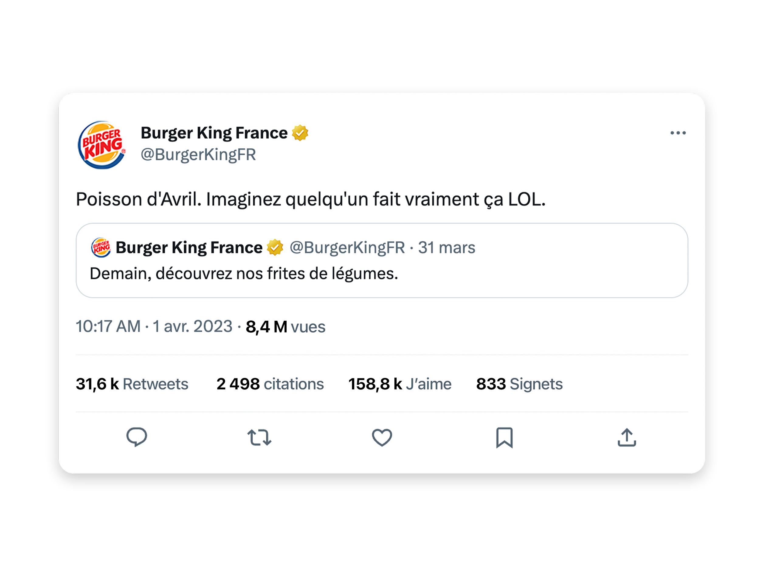 Tout commence le 31 mars 2023, avec un tweet qui annonce l'arrivée d’un nouveau produit en restaurant Burger King : les frites de légumes. Avant de retourner la situation, en assénant le coup de grâce d'un “Poisson d’avril” qui tire pleinement parti de l'absurdité de ce marronnier.