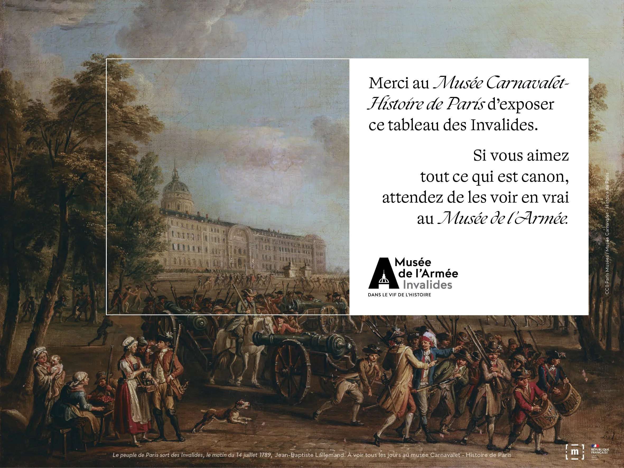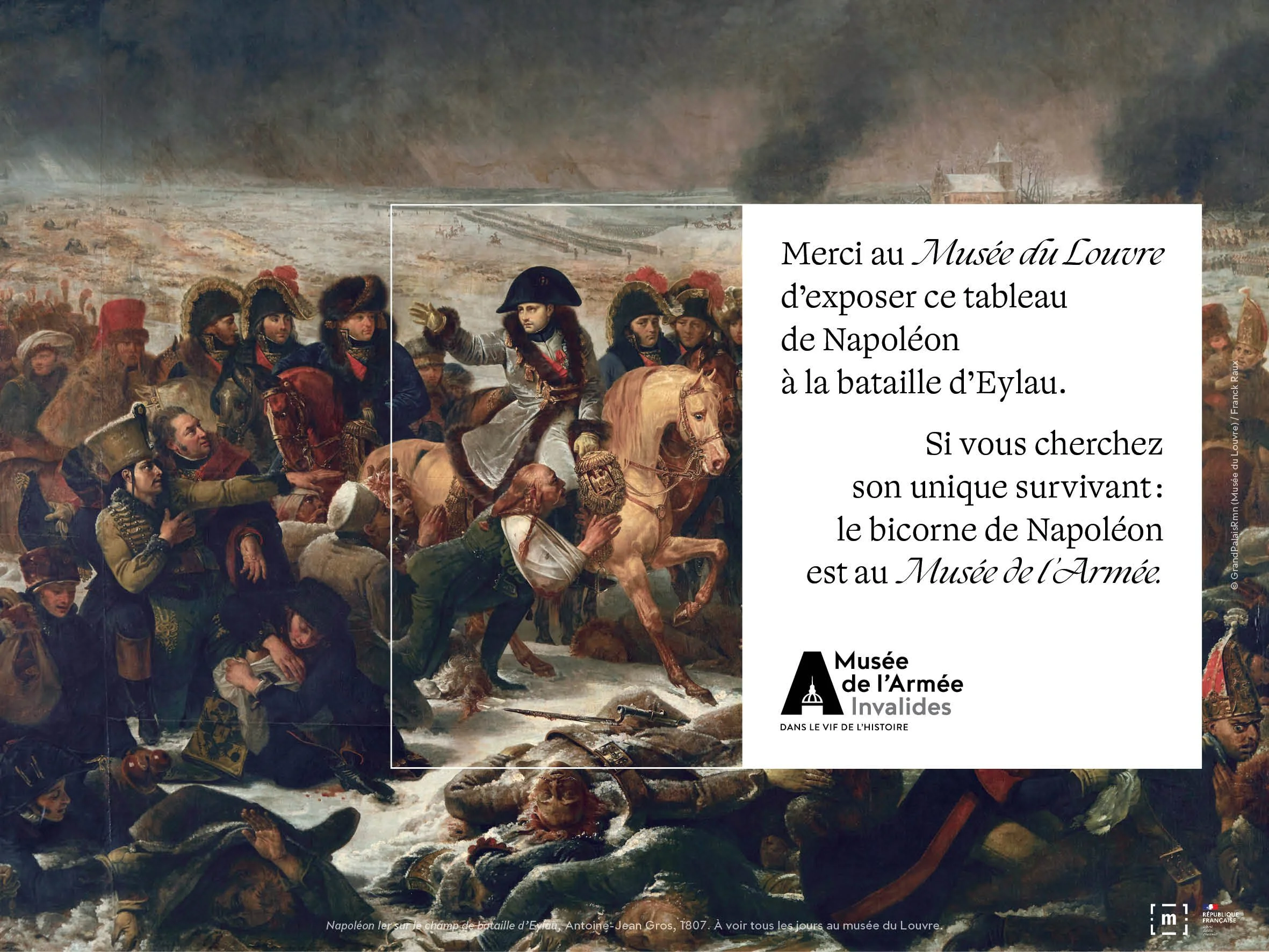 Les œuvres les plus emblématiques des plus grands musées ont été détournées afin de rappeler que les morceaux d’histoire qui y sont représentés sont à découvrir en vrai au musée de l’Armée. Vous avez admiré La liberté guidant le peuple au Louvre ? Vous avez été bouleversé par ce tableau de la terrible bataille d’Eylau de Napoléon ? Et ce célèbre portrait de Louis XIII trônant au Château de Versailles ? Bref, contempler l’histoire en peinture, c’est bien. Mais la voir en vrai au musée de l’Armée, c’est mieux.